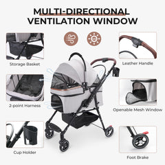 - 【Safety First, Always】Experience total peace of mind with 360° swivel wheels, full suspension system, and reliable rear-wheel brakes. Leash clips inside securely attach to your pet’s harness, keeping them safely seated throughout the ride.